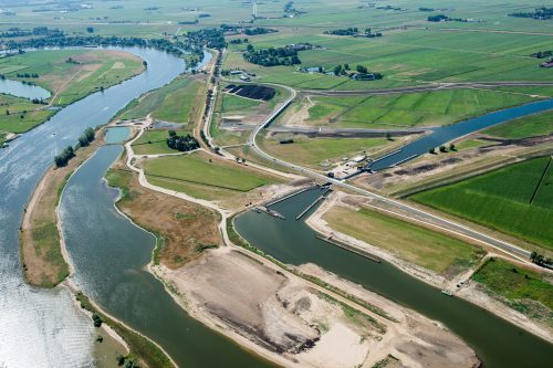 Project Ruimte voor de Rivieren bij Kampen. Lucht foto van het oostelijke deel van de hoogwatergeul Reevediep met het inlaatwerk, de recreatieschutsluis en meestromende nevengeul van de IJssel.